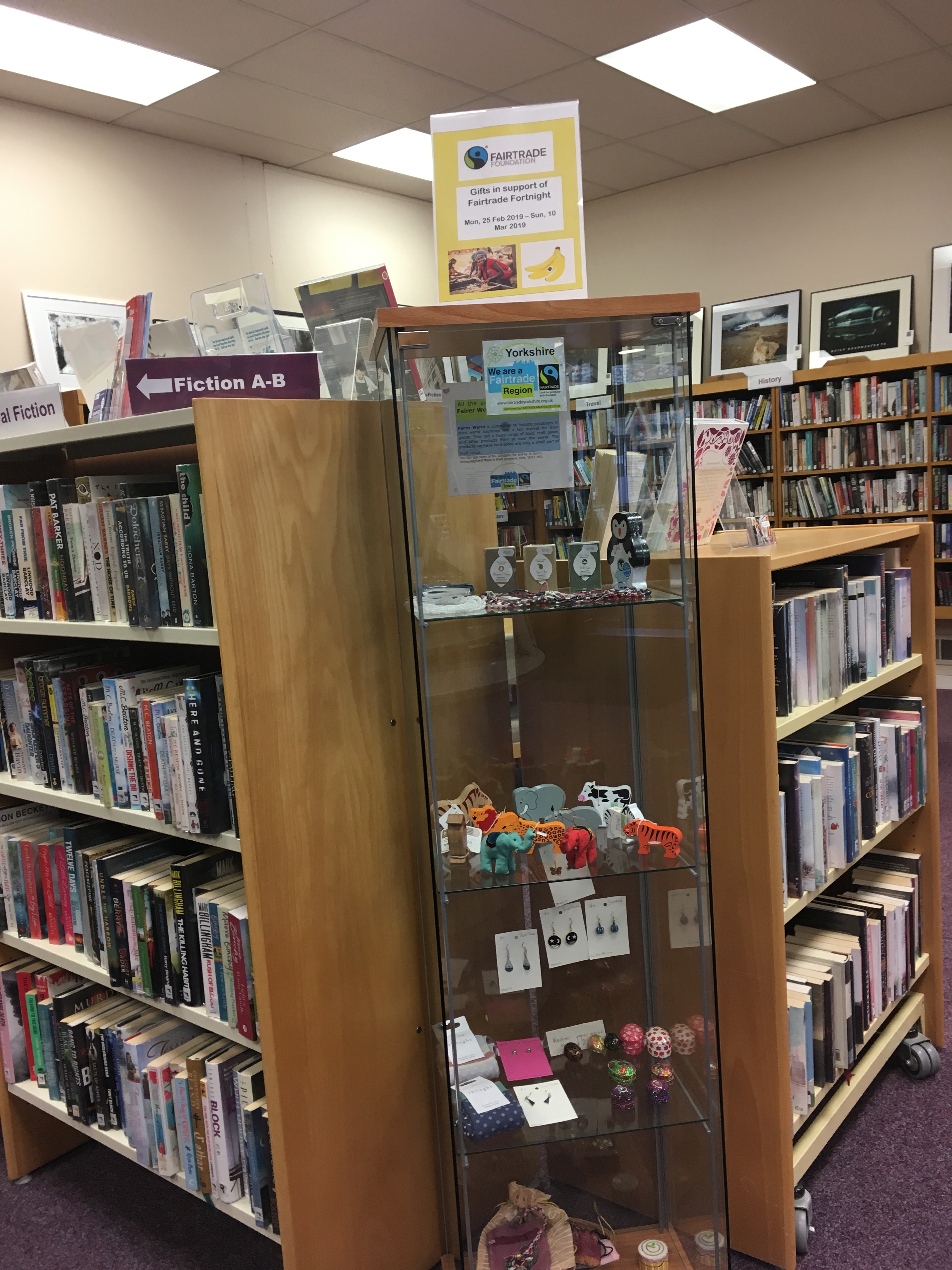 Our cabinet in Malton library, Fairtrade crafts for sale
