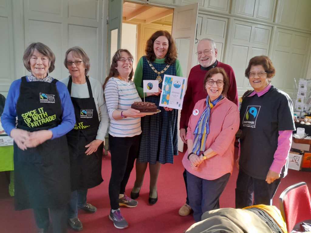 A photo showing the Mayor of Norton, Di Keal, and her Deputy, Martin Brampton, receiving the certificate of our renewal as Malton and Norton Fairtrade towns. Taken at our Spring Fairtrade and Craft Fair.
