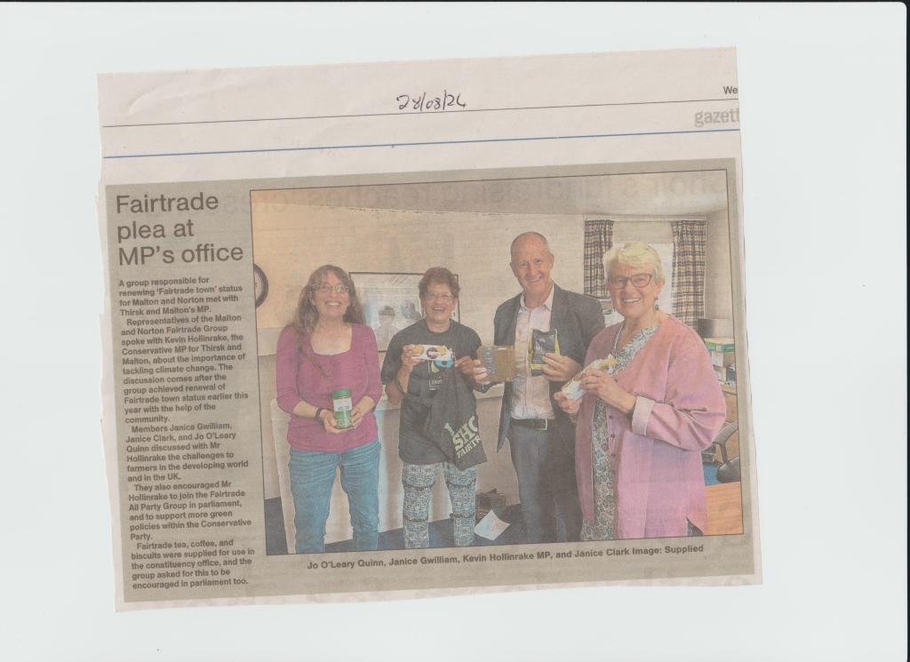 In August we met our MP, Kevin Hollinrake, we gave him FT tea, coffee and biscuits for his office.